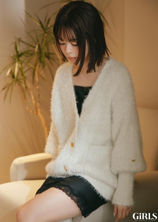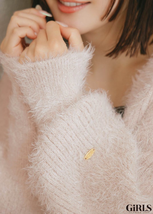毛足が長くふわふわで、上品な輝きのラメ糸入りのフェザーヤーンニットを使用。おしりが隠れるくらいの丈感の大きめなシルエットと、手の甲まで隠れるボリュームのある袖が、あざと可愛い絶妙なバランスです。前左右にはスマートフォンが入る大きさの便利なポケット付き。袖口付近に筆記体で「Momochi」と印字されたゴールドチャーム付きで豪華な印象をプラスしました。ルームウェアとしてはもちろん、お出かけ時にも着用可能。