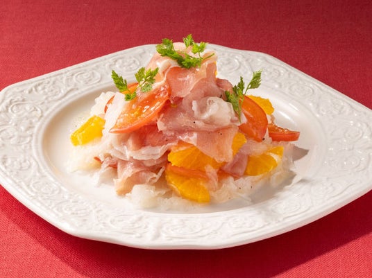 生ハムと、すっきりした甘さのオレンジ、トマト、オニオンスライスをレモンドレッシングで和えました。生ハムの程よい塩味と爽やかなフルーツの甘みと香りがよく合う、お洒落な逸品です。
