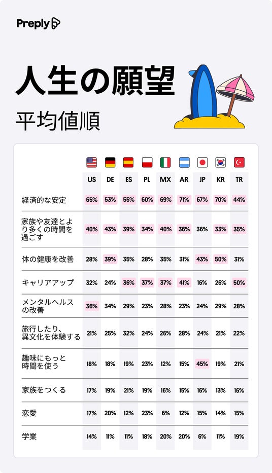世界のZ世代・ミレニアル世代を対象にした調査によると、61%が「経済的な安定」を人生の目標の一つに挙げています。この数値は、次に多かった「友人や家族との時間」や「体の健康を改善すること」よりも24ポイントも高い結果となりました。特に、アルゼンチン、日本、韓国では「経済的な安定」が最も重視されており、日本ではミレニアル世代の64%が、Z世代の59%を上回っています。