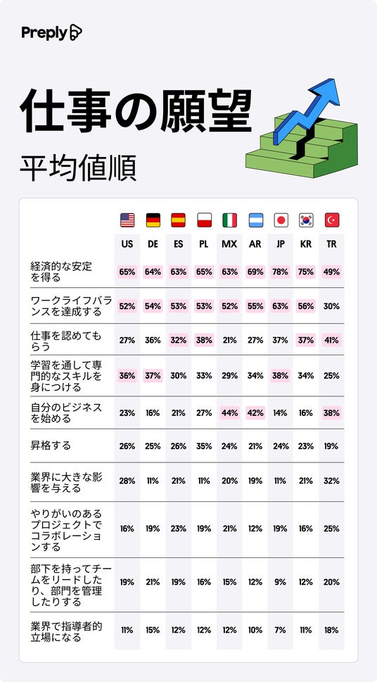 仕事に関連する願望についても、同様に「経済的な安定」が最も多く挙げられました。調査対象者の66%がこれを願望の一つとして選んでおり、その次に多かったのは「仕事とプライベートの両立」と「学びによる専門性スキルの向上」でした。特に、アメリカ、ドイツ、日本ではスキルアップや学習の機会を重視する傾向が強く見られます。一方で、アルゼンチン、メキシコ、トルコでは、約4割の人々が「自分のビジネスを始めたい」という起業への意欲を持っていることが明らかになりました。このように、各国で異なる仕事に対する目標が浮き彫りになっています。