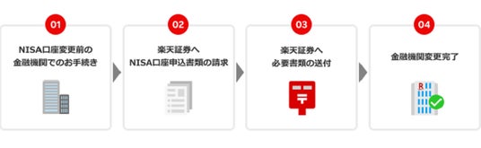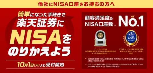 楽天証券株式会社(本社:東京都港区、代表取締役社長:楠 雄治、以下「楽天証券」)は、2024年10月1日(火)より、NISAの金融機関変更手続きの利便性を向上し、書面を送付することなく、ウェブサイトで手続きが完了(※1)できるようになることをお知らせします。また、2025年1月から投資信託の積立をスムーズに開始できるように、事前に積立設定ができる「ウェルカム積立予約」サービスの提供も予定しています。本年10月以降に2025年のNISA口座を他金融機関から楽天証券に変更されるお客様が、2025年1月から簡単、かつ、お得にNISAを活用した資産づくりをはじめられる環境を提供します。