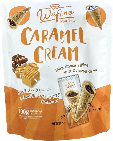 商品特徴:キャラメルクリーム、ミルクチョコをサクサクのワッフル生地で包みました。コーンカップ型の見た目もかわいいチョコレート菓子。便利な個包装仕様。
