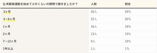 元々の運動・生活習慣や体重にもよりますが、有酸素運動で痩せられたと回答している方は以下のように3カ月~6カ月程度は習慣として継続しているようです。