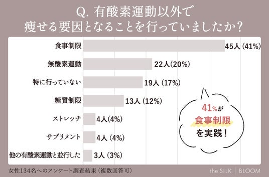 「特に何もしていない」という回答が17%と少なく、ほとんどの方が有酸素運動と並行して痩せるために努力していることが伺えます。