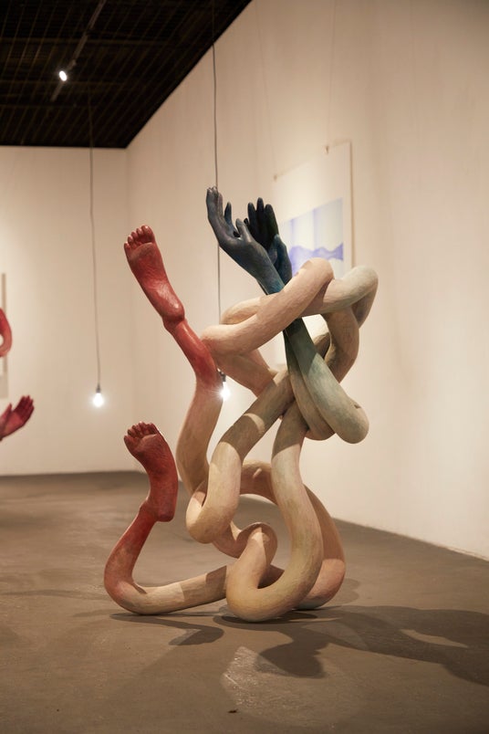増田麻由の作品に共通する「重力から解放された手足が伸びる造形」「手足が捻れる造形」の原点は、バレエやジャズダンスの表現にあります。現代社会を生きることの違和感と、それによって沸き起こった心の声を、あるときはのびやかに、あるときは不自由に絡み合う手足によって、作品は私たちに豊かな表情を見せてくれます。本展では、増田が今回注目した ’素敵’ という概念を軸に、彫刻3体のほか小作品も含めて展示します。増田にとって ’素敵’ とは、ありのままの状態でいるときに日々揺れ動く私たちの中に存在するものでありながら、捉えどころのない概念と考えています。その心象風景を木彫の柔らかな曲線によって表しています。