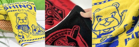 色糸と白糸の2色でデザインを凹凸に織り込み、立体的に表現する方法です。同系色の仕上がりになります。今治産の生地で吸水性抜群なパイル仕上げです。