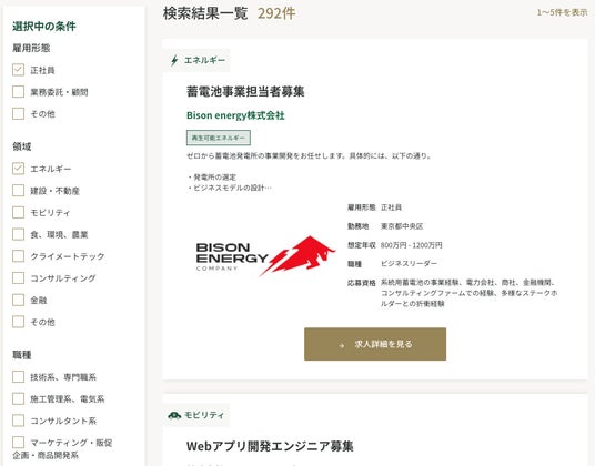 脱炭素領域に特化した求人検索機能