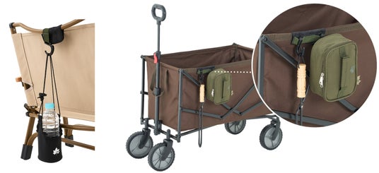 取り外しのできるフックが2つ付属し、フックに掛けたり、ループベルトにカラビナを付けて吊るしたりと使い方は様々。