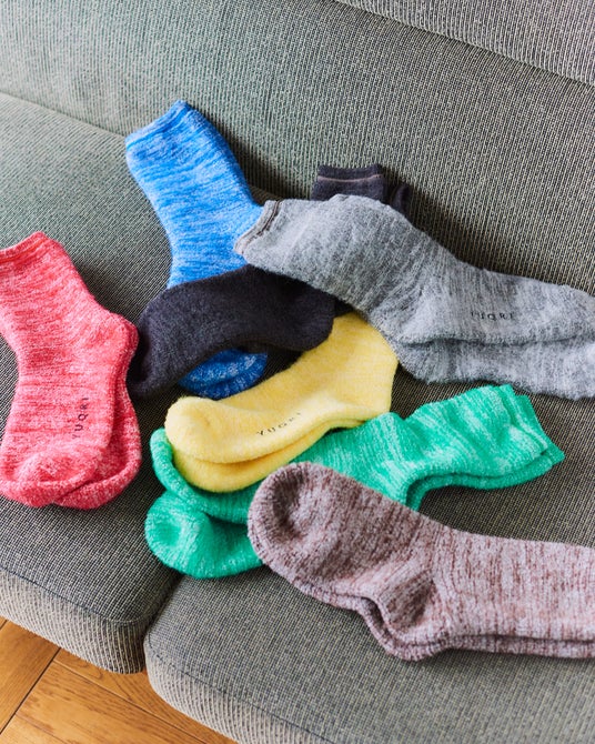定番のpuff pileをブラッシュアップしてウォーム感をプラス。 YUQRI のスタンダードアイテムを秋冬仕上げにしました。 2 種の糸を引き揃えることで、特有の膨らみと温かみある表情に。 さらにパイルを表にし、ブラッシュすることでその風合いを最大に引き出しています。 表裏それぞれ異なる表情で履いて頂けるダブルフェイス仕様もポイント。 超低速で編むことでしかこの製品は作り上げることができません。 1 時間に3~4足程しか編みあがらないため大量生産はできませんが、他には無い独特の表情を持っています。