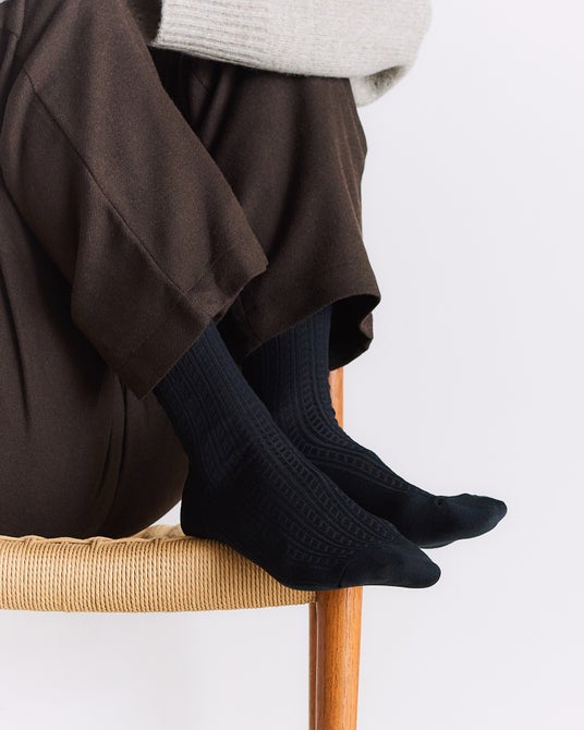 繊細なケーブル柄がトラディショナルなムードを演出。 クラシックなケーブル柄をタイトにリサイズすることで、今の気分に合う足元に昇華。 丈をややロングにすることで新鮮な違和感を楽しめます。 素材には上質な綿コーマ糸を使用。毛羽立ちが抑えられ、綿の風合いや目面の綺麗さを引き立てる素材です。 吸水性、吸湿性が高く、綿は夏に涼しく着られるだけでなく、実は保温性にも優れている特徴があります。 1 年を通して履いて頂けるアイテムです。
