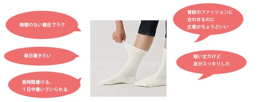 着圧ソックスは、むくみケアの代表的アイテムとして、立ち仕事など働きながらケアしたい方向けのハードタイプから、おうちでのリラックスタイムや就寝時のケア用などがあります。しかし、現行の着圧ソックスについてヒアリング調査を実施したところ、「きつめの着圧が苦手」「黒しかないから履かない」「ハイソックスは履かないので着用機会がない」など、強い着圧に対する抵抗感や、日常的に履けるデザインへのニーズがあることがわかりました。