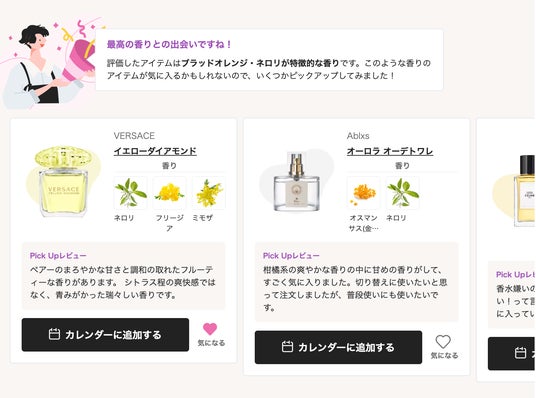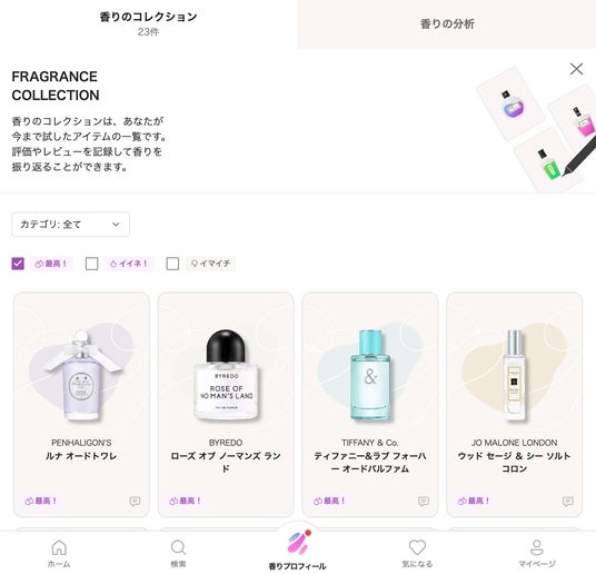 これまで試したアイテムをコレクションしたり、振り返りやすくするため、香りのコレクションをフレグランスプロフィール内に設置