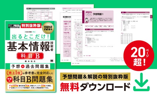 株式会社翔泳社(本社:東京都新宿区舟町5、社長:佐々木幹夫)は、書籍『情報処理教科書 出るとこだけ!基本情報技術者[科目B]予想+過去問題集』を2024年9月25日に発売するのに先駆け、本日9月19日より予想問題と解説の特別抜粋資料を無料で配布します。