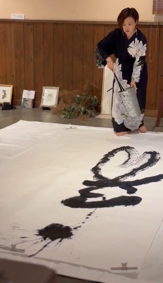 書道パフォーマンスでは、塔下游心(YUSHIN)が、大きなキャンバスに大きな
