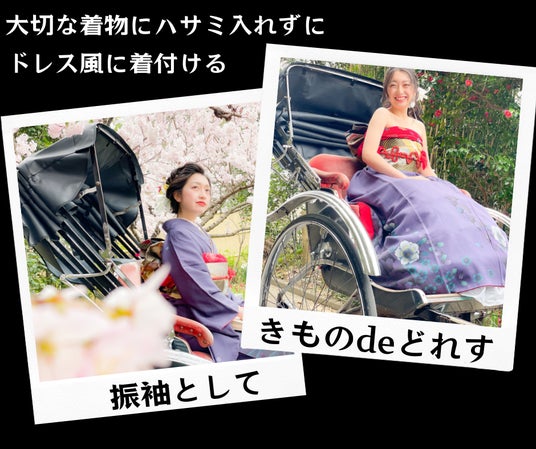「きものdeどれず(R)」とは、日本の伝統的な着物を洋装ドレス風に着せる着付けです。着物・帯・帯周りの着付けに使う小物(帯締め・帯上げ等)を全て使用します。日本の古き良き文化の着物を残しつつ、更に新しい技術と掛け合わせた、雅で華やかな融合舞台を披露します。