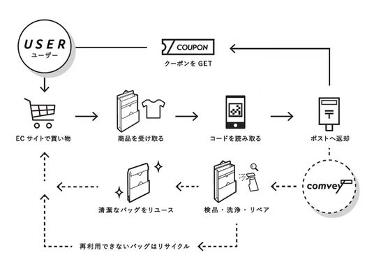 LAEMUSEでは配送サービスに、「リユースでサステナブルな購入体験を」がコンセプトの「comvey(コンベイ)」を採用。商品購入時に選択できる「シェアバッグ」は、ポストに返却可能。ECにおける梱包ごみの課題にブランドファンと一緒に取り組みます。
