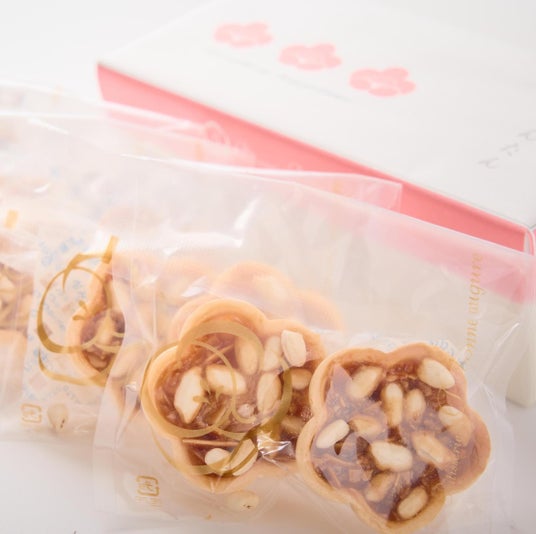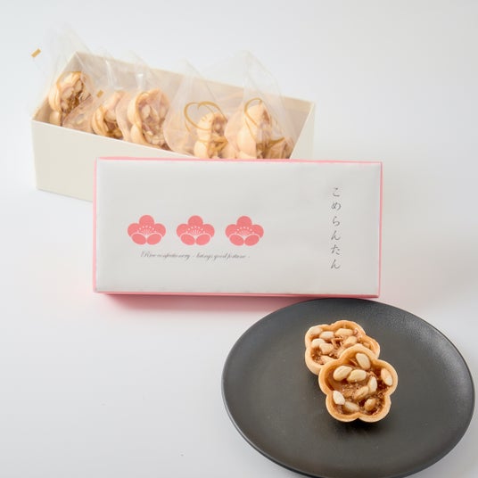 「こめらんたん」は縁起の良い梅をあしらったオリジナルボックスに入れてご用意しました。見た目にも可愛らしく、オリジナリティーがあり、引き菓子や内祝い、接待の手土産としてもおすすめです。