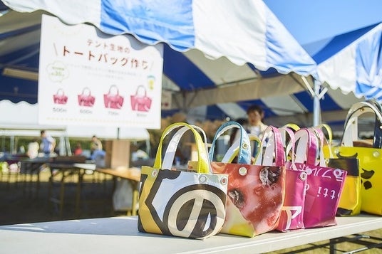 使用後のテント布を有効活用 テント布でつくるマイバッグイベントで使用したテント布でマイバックをつくります。リユース素材で作る、世界にひとつだけのマイバックです。