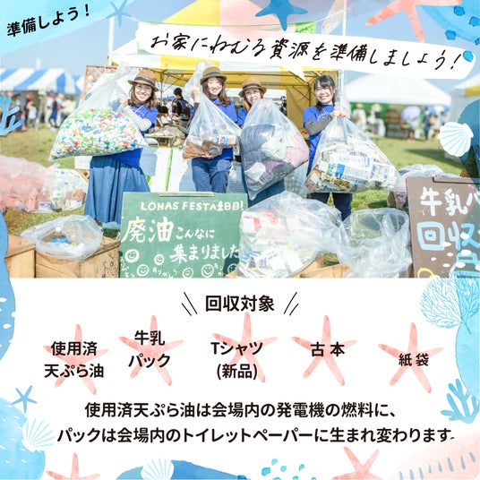 ロハスフェスタでは、使用済天ぷら油、牛乳パックなど、ご家庭の不用品を回収し、循環する「エコリサイクルコーナー」を設けています。特に使用済天ぷら油は、会場で消費する電気をBDFで全てまかなえる量の回収を目指しています。また、マイ食器・マイボトルの持参を呼び掛け、会場内はリユース食器(何度も繰り返し洗って使用)だけを使用し、使い捨て容器を減らしてゴミゼロを目指しています。