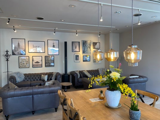 ソファ・テーブル・カウンターテーブル席を備える広々とした空間。