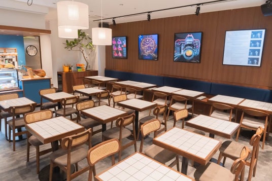 店内はアートと音楽を楽しむ大人のレストラン&カフェをイメージし、ウッディで落ち着いた雰囲気。