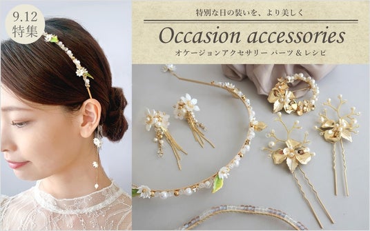 パールやビジューなど、クラシックな輝きと上手に組み合わせたメタルパーツやボタニカルモチーフが、特別な日をさらに華やかに彩ってくれます。 お気に入りのドレスやセットアップでのコーディネートをクラスアップできそうな、手作りできるオケージョンアクセサリーのパーツやレシピをご紹介します。