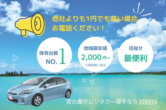 カイトコーポレーション株式会社(所在地:沖縄県宮古島市)が運営する「ミヤクティブレンタカー」は、他社よりも1円でも安くレンタカーを提供するサービスを開始しました。