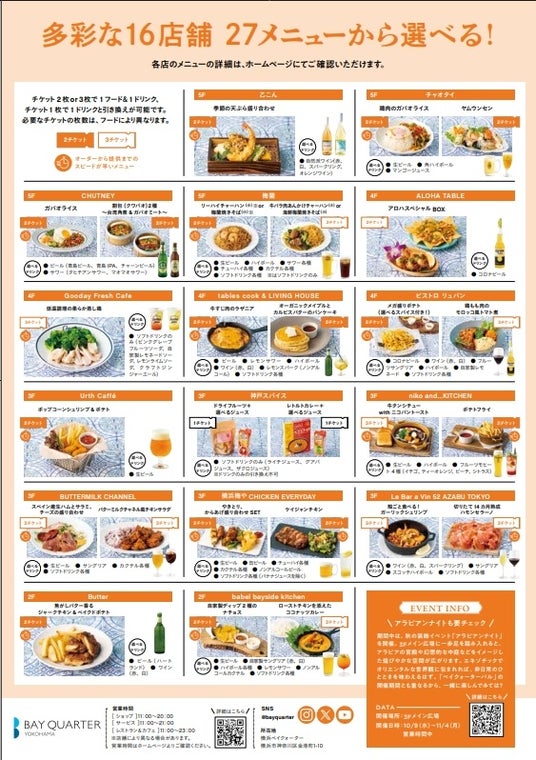 2024年で8回目となる「ベイクォーターバル」。期間中はバルチケット(有料)1枚で[ドリンク1杯]、2枚または3枚で[フード1品とドリンク1杯]の特別セットをご提供いたします。メニューは全16店舗・27種類からセレクトでき、エスニックや中華、和食からデザートまで多様なラインナップを用意。お料理やドリンクはテイクアウトして館内の特設テラス席でお楽しみいただけます。