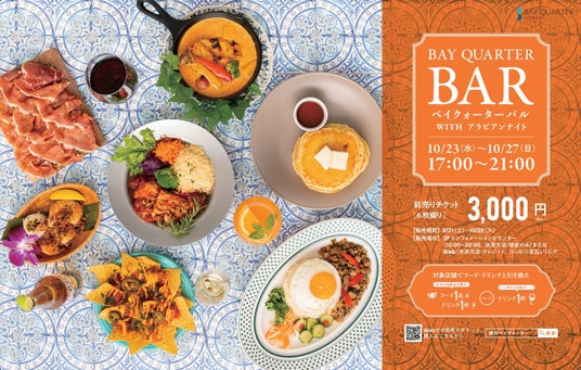 期間中は3階メイン広場にて、秋の装飾イベント「アラビアンナイト」を開催しております。オリエンタルな世界観が広がり、煌びやかに輝くメイン広場にも特設テラス席を設けておりますので、イルミネーションを楽しみながら「ベイクォーターバル」で素敵な夜をお過ごしください。