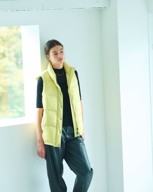 すっきりとしたクルーネックのロングライトダウンは、スクエアキルティングのデザインがカジュアル過ぎず、上品に見せてくれます。ダウンベストは、コーディネートのポイントになるよう少しボリューム感があり、長めの着丈でタックパンツやワンピースなど様々なアイテムと合わせやすいデザインに落とし込んでいます。