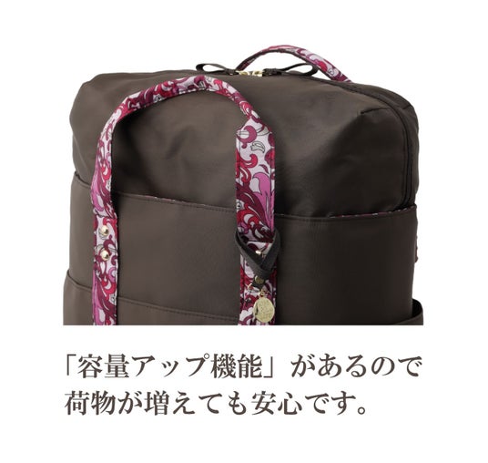 容量たっぷり!機能性も抜群なんと嬉しい容量アップ機能付き!お出かけに必要な荷物をたっぷ り収納でき、またお出かけ先で買い物しすぎたなんて時でも安心です。