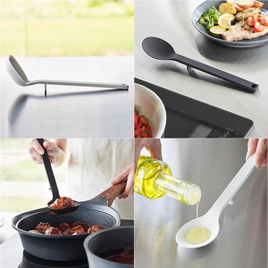 フライパン・鍋などを傷つけないシリコーン製のお玉・調理スプーン。