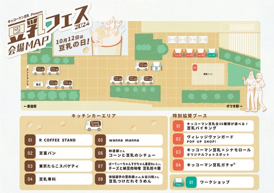 本イベントでは、キッコーマン豆乳のCMキャラクターを務める俳優の林遣都さん、日ごろから豆乳を愛飲している体操選手の萱和磨さん&谷川航さん、豆乳を愛飲しているお笑いトリオぱーてぃーちゃんのすがちゃん最高No.1さんが監修した豆乳メニューや、「R COFFEE STAND」や「東京たらこスパゲティ」などの人気店が本イベントのために用意した限定の豆乳メニューを提供いたします。また、豆乳好きから大きな支持を集める「豆乳専科」、「豆富パン」、「wanna manna(ワナマナ)」のキッチンカーが登場。ここでしか食べられない豆乳料理や豆乳スイーツをお楽しみいただけます。