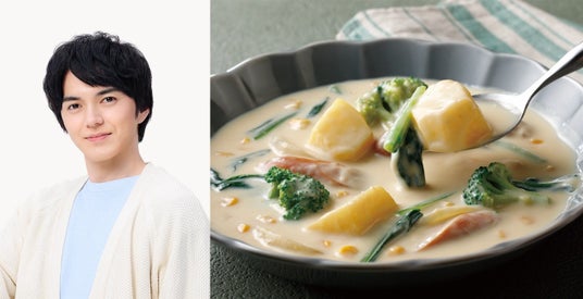 キッコーマン豆乳のCMキャラクターも務める俳優の林遣都さんが、ご自宅でもつくっているという『林家特製豆乳シチュー』。コーンと小松菜が入っており、ほのかに味噌の風味が広がるまろやかな味わいで、お子さまにもおすすめです。
