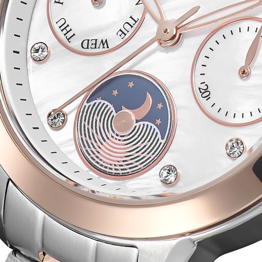 サン&ムーンを含む多機能搭載6時位置には時間の経過とともに月と太陽が姿を現すサン&ムーン機能を搭載。