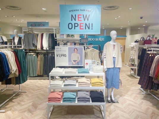 「居心地のいい空間」をテーマに、白を基調とし木の温かみをプラスした内装が特長となっております。約40坪の店中には、主力ブランドの「SHOO・LA・RUE(シューラルー)」に加え、デイリーユースで活躍するフェミニンテイストの「DRESKIP(ドレスキップ)」、ファッション雑貨など幅広い商品を取り揃え、シンプルながら機能的な什器を用いることで、お客様が欲しい商品をすぐに見つけられるような工夫を凝らしています。
