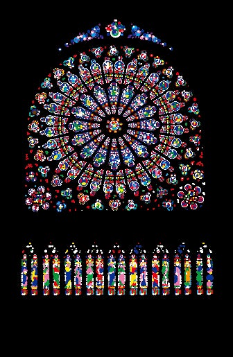 「forNotre-Dame」 縦100×横65センチメートル 2019年発表2019年4月15日夜(現地時間)、大規模火災により尖塔などを焼失したノートルダム大聖堂。大村は2018年フランスで個展を行った際、この大聖堂を訪れている。その時に感じた温かみのある荘厳さ、感謝と哀悼の意を込め、ステンドグラスをモチーフとして連作を制作。その内、代表的な薔薇窓をテーマにした作品。