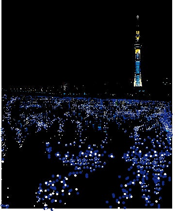 「東京ホタル」 縦130×横97センチメートル 2018年発表2012年に隅田川で行われたイベント「東京ホタル」。隅田川にホタルに見立てた青色LEDを放流し、東京スカイツリーを全点灯させた。その光景を切り取った作品。水面にたゆたう青の光の揺らぎを表現。