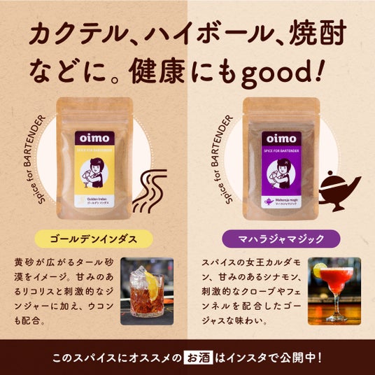 オリジナルミックススパイス・・・「ひと振りで世界旅行」をコンセプトに、いつものコーヒーやラテ、スイーツ、お酒などに豊かな香りを加える、oimoオリジナルブレンド。イギリス、フランス、インドなど各国で親しまれてきた香りが手軽に楽しめます。また、ミックススパイスは製菓、製パン材料にも使えます。