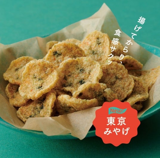 製品特徴:こだわり天然えびに国産黒のりの風味ふんわり。揚げてからり、食感サクッ、TOKYOラブなエビチップス。