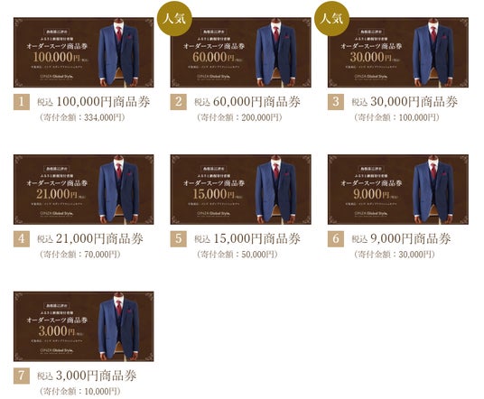 返礼品には、島根県・江津市にある提携工場トップソーイング社と鳥取県・鳥取市のグッドヒル社の共同企画により、全国のグローバルスタイルでご利用いただける「商品券」をご用意しております。