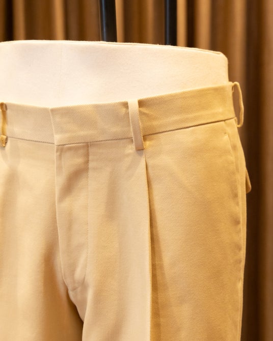 新型となるアウトワンプリーツのストレートシルエットモデル。 ヒップからわたりにかけてほどよくボリュームを持たせ、フレンチクラシックをイメージした深めのプリーツとピスポケットのフラップ仕様が特徴です。