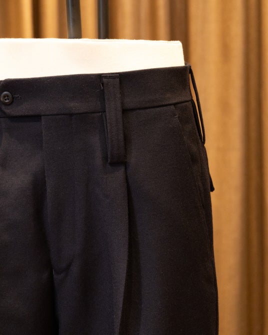 深めのプリーツと長めのベルトループに加え、幅広い体型にフィットするのが特徴です。
