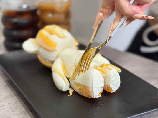 カフェで提供されるハーフクマケーキ(2,200円)は、ムースとフルーツゼリーで作られた可愛いくま型のデザートです。6種類のソースから選んでカスタマイズでき、自分だけの特別なケーキを作って実際に食べていただくことができます。