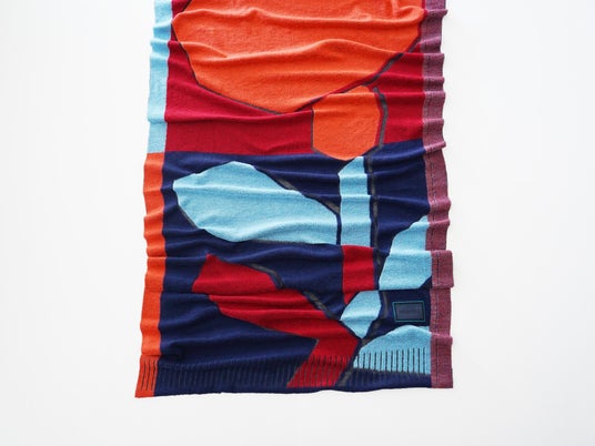 山形の県花である「紅花」は山形の夏を象徴する花であり、米沢織の歴史に深い関係を持つ花です。 一輪の紅花を大胆に構成し、形の面白さと色遊びの楽しさが溢れるストールは、 輪郭に用いた透かしの技法により、軽やかで洗練された雰囲気を演出します。