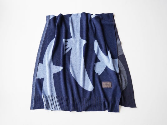 木々が集まり、どこまでも広がっていく森を表現しています。 葉っぱや枝の重なりは大まかな輪郭だけなぞって青で塗り、幹が交差する部分を格子柄で表現することで、 2種類の生地が合わさったような遊び満載のストール。ハサミでカットしてアレンジも可能です。