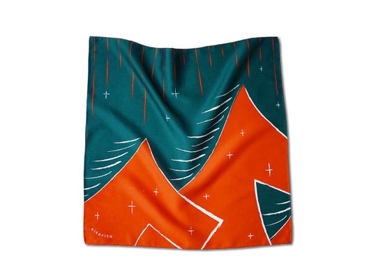 米沢の冬の始まりと終わりを伝える風物詩、西吾妻山の「白馬の騎士」をモチーフにしたハンカチ。白馬がたてがみをなびかせながら走る姿にも、 山々が連なっている姿にも見えるデザイン 米沢の自然風景と文化を同時に感じる一枚です。