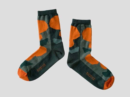 山形の県花「紅花」をモチーフにした靴下。 一見大きなドットに見える模様は、ぷっくりと丸い形が特徴の紅花を大胆にデザインしたもの。 見る角度によってさまざまな色や形が現れるよう工夫して配置しているため、 飽きのこない遊び心が詰まった一足です。