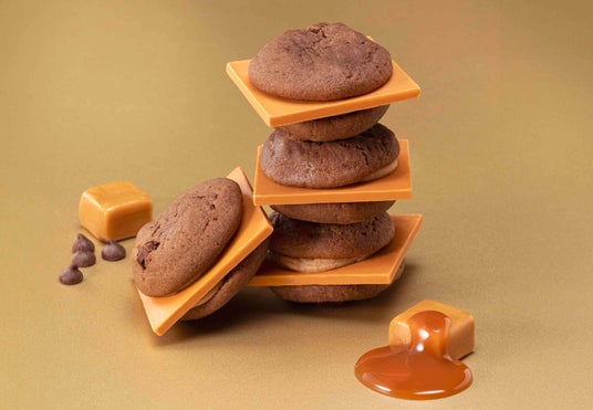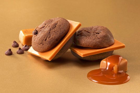 “チョコチップ”が練り込まれたしっとりやわらかな“ココアソフトクッキー”で、はみ出るほど大きな“キャラメルショコラ”と、くちどけなめらかな“キャラメルホイップショコラ”のWキャラメルをサンドしました。ひとくちかぶりつくと、ほんのりビターなソフトクッキーの間から、キャラメルのコクと甘みがとろ~り!独自配合の生地を高温短時間で焼き上げた、どこまでもやわらかな生食感と、口いっぱいに広がる優しい甘みがたまらない、グルメなスイーツバーガーです。