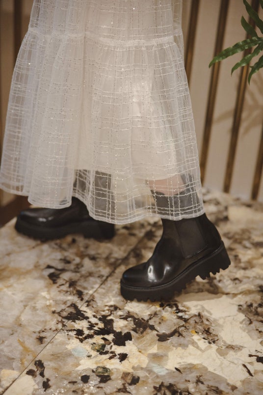 代休をとった水曜日。レタードニット×キラキラスカートの感度高めな装いでギャラリーに。